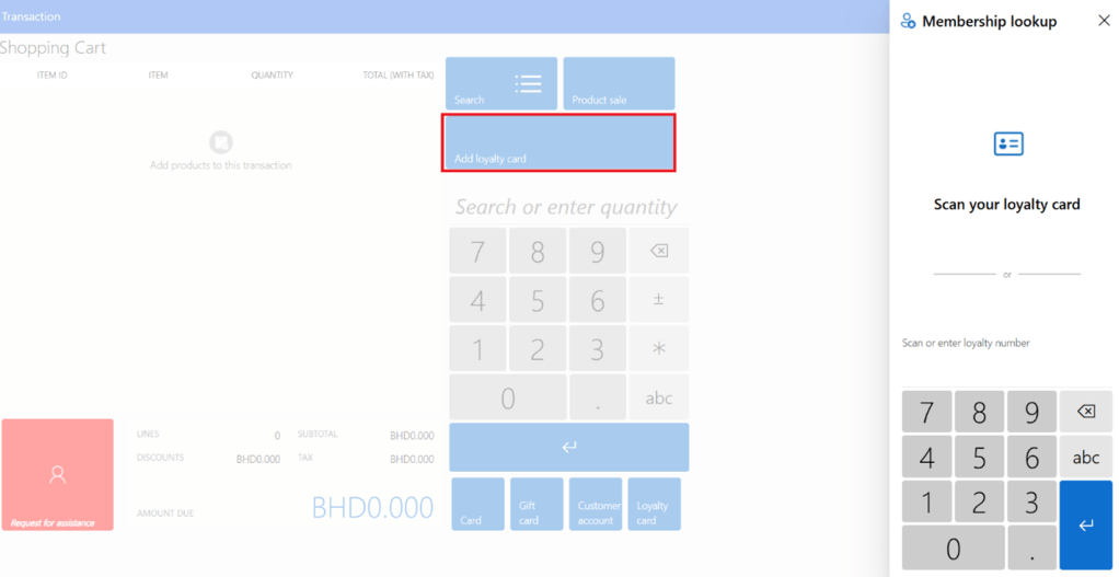 Customers or staff can search by item code using the “Product Sale” option, which brings up a keypad to add the item to the basket. They can also scan or enter a loyalty card through the “Add Loyalty Card” option.